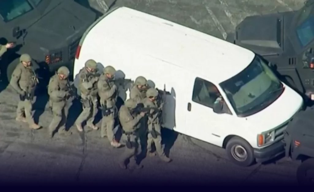 Agentes armados rodearon una camioneta blanca en la localidad de Torrance, más de 12 horas después del tiroteo. Rompieron la ventana de la camioneta y encontraron el cuerpo.