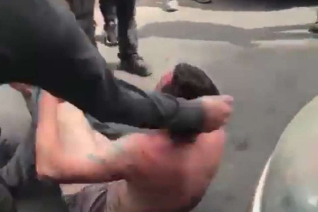 Él yace tendido en el suelo y trata de cubrirse. Varios le retiran la ropa y continúan los golpes.