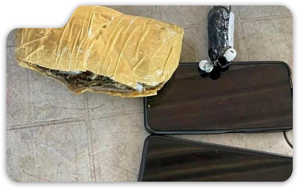 Entre los elementos encontrados había dos teléfonos celulares y un paquete de 203 gramos de marihuana, envuelto en cinta adhesiva amarilla. El policía llevaba estos objetos en un bolso negro, y las Fuerzas Armadas informaron del incidente a la Policía Nacional, que inició el procedimiento correspondiente.
