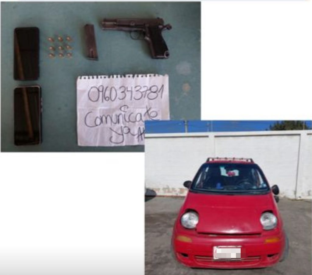 Durante la intervención, los oficiales observarán un vehículo rojo rodeado por vecinos. Inmediatamente, los ocupantes del auto fueron bajados y, tras una minuciosa inspección, se encontró un arma de fuego con la inscripción «Ejército Ecuatoriano».
