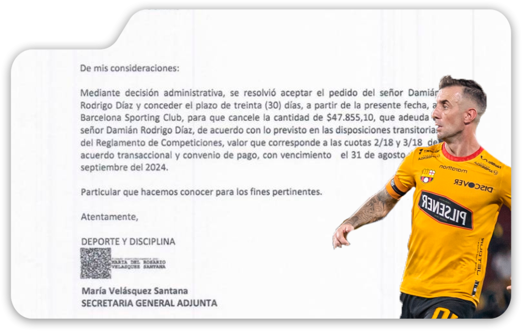 La deuda ha sido solicitada ante la Federación Ecuatoriana de Fútbol (FEF), que ha concedido a Barcelona SC un plazo de 30 días para cancelar a Díaz un monto de USD 47.855,10, correspondiente a las cuotas 2/18 y 3/18, vencidas en agosto y septiembre de 2024.
