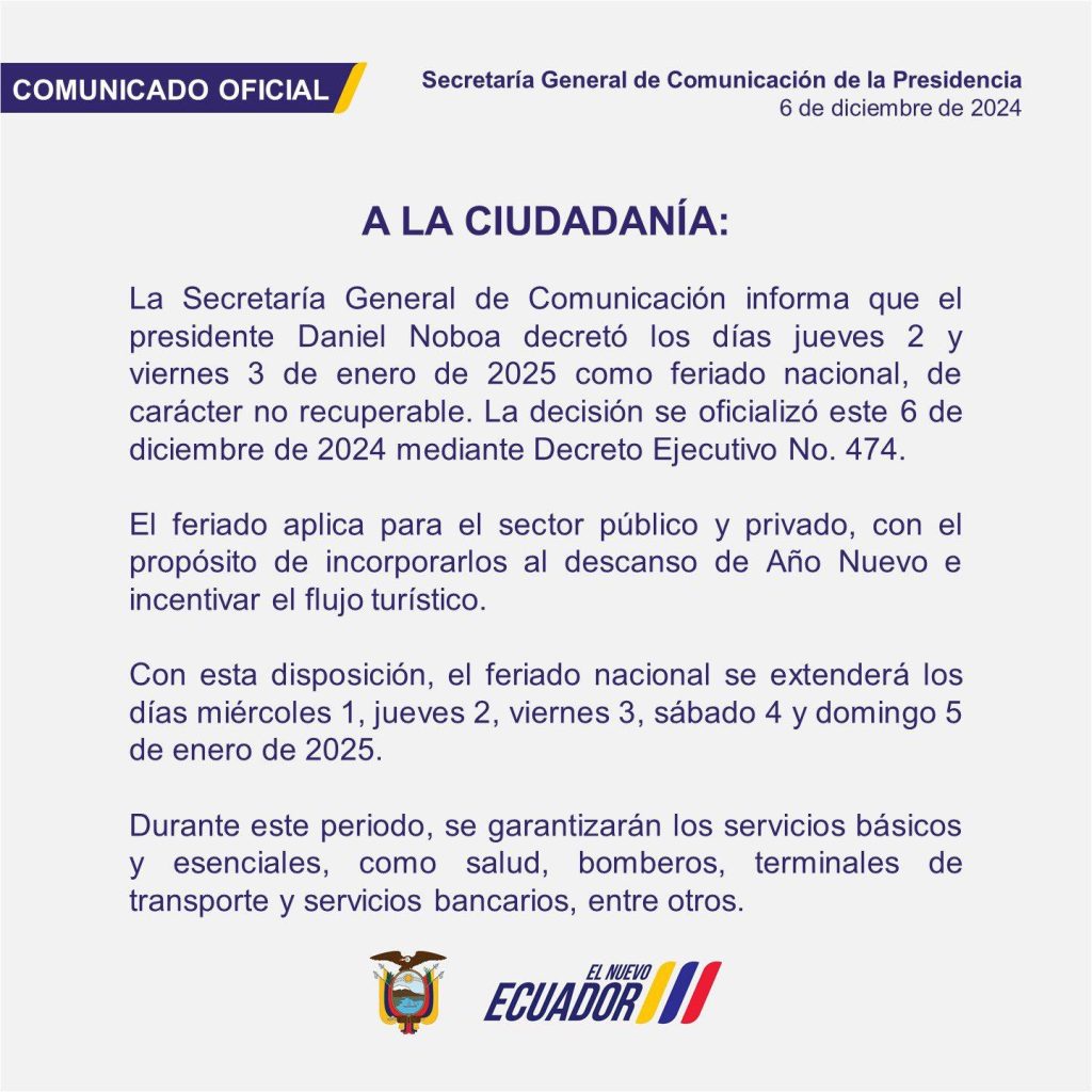 La Secretaría General de Comunicación informó que el presidente Daniel Noboa oficializó, mediante el Decreto Ejecutivo No. 474, un feriado nacional no recuperable para los días jueves 2 y viernes 3 de enero de 2025. Con esta decisión, el descanso de Año Nuevo se extenderá del miércoles 1 al domingo 5 de enero.