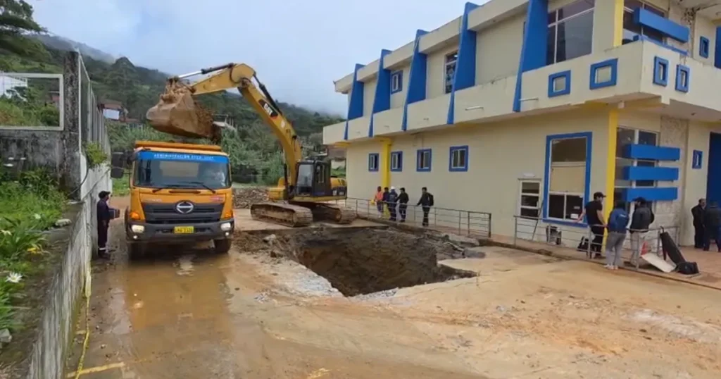 El enorme hoyo se formó tras el hundimiento de la calzada, aparentemente provocado por las intensas lluvias que soportó esa localidad esta semana. Maquinaria pesada trabaja en el sitio, removiendo tierra, hormigón y piedras para reparar el daño y restablecer el acceso.