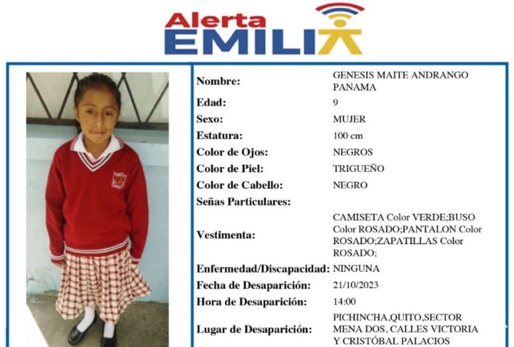 Las autoridades activaron la Alerta Emilia. La Fiscalía informó que se busca a la niña Génesis Maité Andrango Panamá. Tiene 9 años y fue